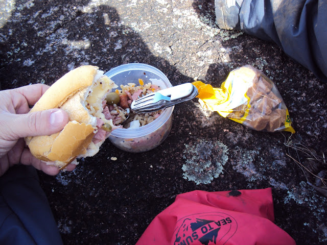Subimos até o cume do Camapuã onde fizemos um pit stop, pão com queijo e presunto, e levei arroz 7 cereais com azeitonas, ovo e mais alguns trecos,, tacamo tudo dentro dos pães e vapeeee,,, ficou um Mellllllllllll